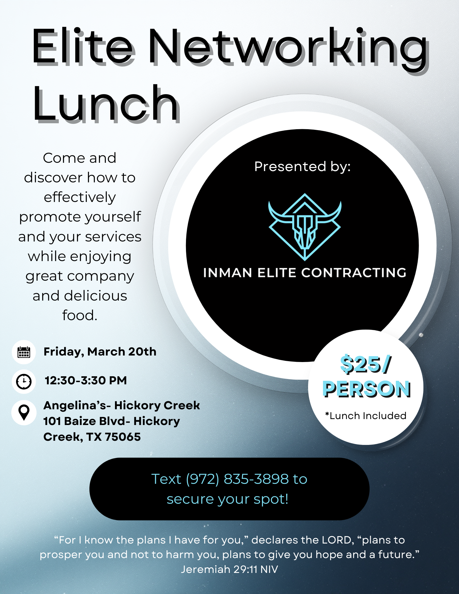 Our monthly networking event is built for small business owners and entrepreneurs who believe in the values of God, Family, and the American Dream. Held once a month in the Lake Cities area, this event is more than just exchanging business cards - it’s a place to build genuine relationships with like-minded individuals who understand the challenges and rewards of running a business. Each event also features a practical learning presentation covering topics like business planning, sales, and marketing, so you always walk away with a valuable takeaway you can apply right away. The cost is $25 per person, which includes lunch, making it an easy and worthwhile investment in both your business and your network. We believe no one should have to navigate entrepreneurship alone, and our goal is to create a supportive community where you can grow, learn, and succeed alongside others on the same journey.